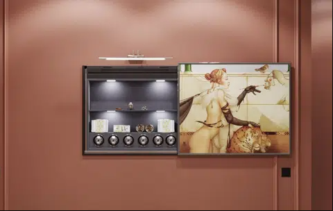 Две стихии встречаются: живое тепло огня и холодная надежность швейцарской стали. Мы разработали уникальную систему встраивания сейфового пространства в стеновую панель над камином. Никаких видимых швов, никаких намеков на присутствие тайника. Только безупречная архитектурная поверхность,